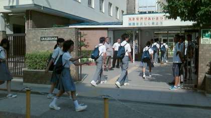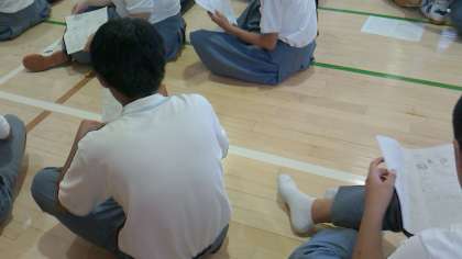 3年生は9時に、2年生は10時に、1年生は11時に学年別・時間差で体育館に登校してきました。夏休みも1か月が過ぎ、久しぶりの登校となりました。部活動生だけの登校とは違い、全校生の登校となるとにぎやかなものでした。