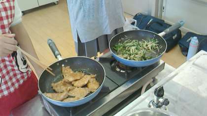 調味料を合わせてつけ汁を作り、豚肉に絡めます。フライパンを中火で熱して油を入れ、肉を広げて焦げないように、焼いていきました。また付け合せの野菜も炒めて、つけ汁に絡めて火を通していました。