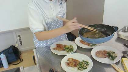 部員たちの実習のねらいは主菜を作ることとして、豚の生姜焼きに取り組みました。