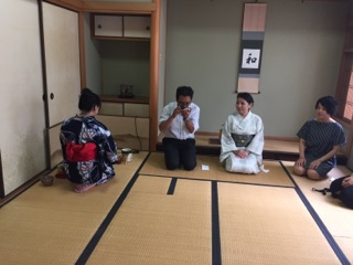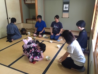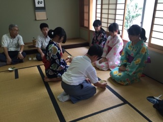 浴衣を着付てもらい、普段と違う足さばきに戸惑いながらも、先生方にお点前を披露することができました。