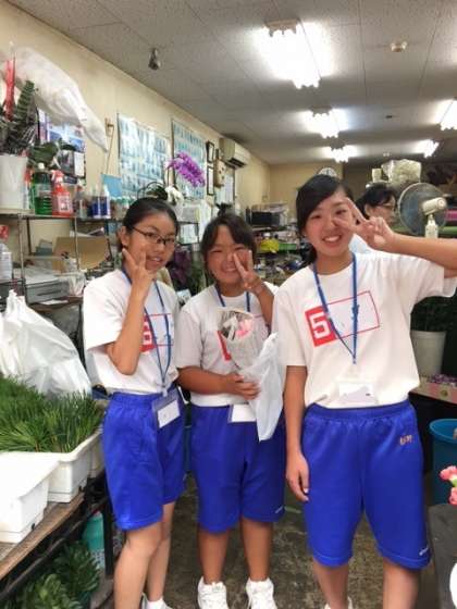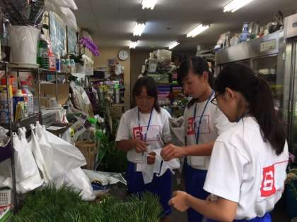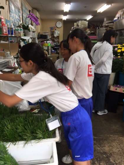 サンリバー内のお花屋さんです。元気に明るく接客し、注文を受けた切り花を新聞紙で梱包しています。