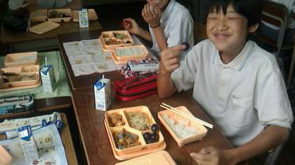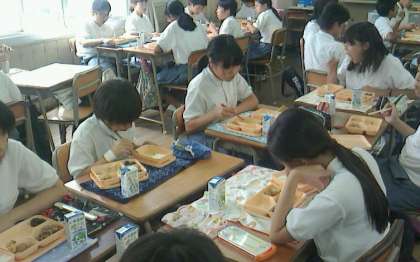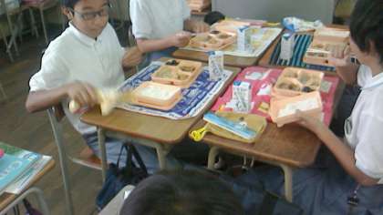 1年生は4〜6人ぐらいで班を作り、机を寄せての給食です。語らいながらの楽しいひと時です。巨峰を譲り受け、おいしそうにほおばる生徒を見かけました。