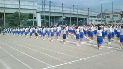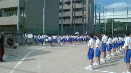 体操(上の写真)の後には自分の座席への退場練習(真ん中の写真)や、閉会式時の集合方法を繰り返し学びました。