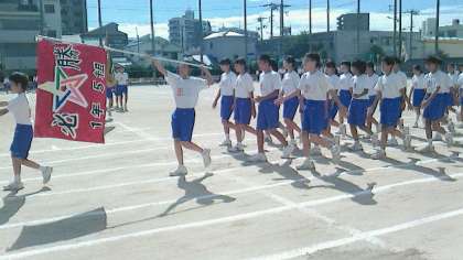 第1グランドに整列をし、生徒会役員による体育大会旗を先頭にして1年生・3年生・2年生の順に、第2グランドへ向かいました。