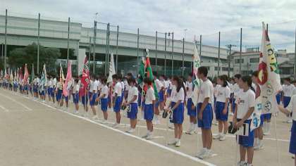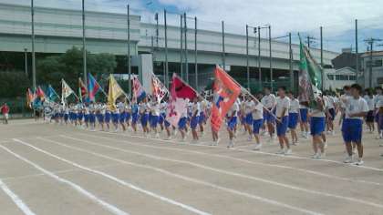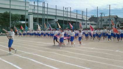 全生徒が第2グランドを入場行進で周回し、全クラス朝礼台前に整列しました。