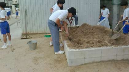 低いところにはスコップやバケツを利用して、新しい細かな土を補給し、レーキでならした後は、大人数で踏み固めてくれました。