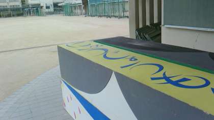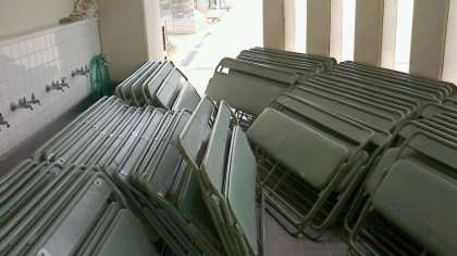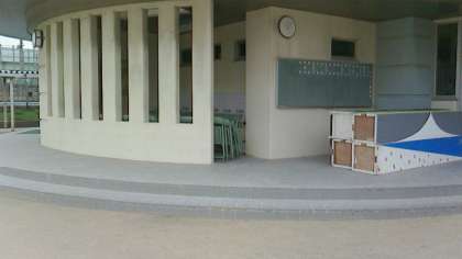 体育館から運び出してきた長イスとともに、入場門・退場門も、1号館の1階ピロティー横で、一時待機です。明日の出番に備えています。