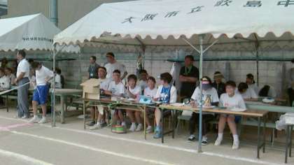 グランドでは用具準備係が競技用具を準備してくれています。競技審判係はスタートから着順判定までを担当しています。本部席では放送の係がアナウンスをしています。また記録係は得点集計を計算しています。