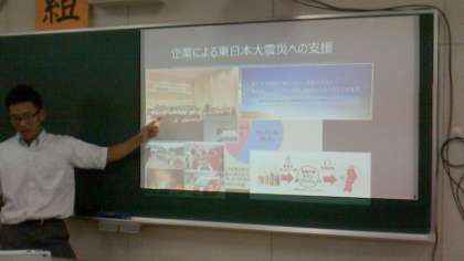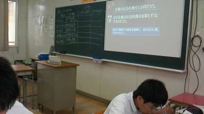 4人の班別学習で、大阪の企業の具体的な事例をまとめていました。