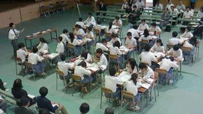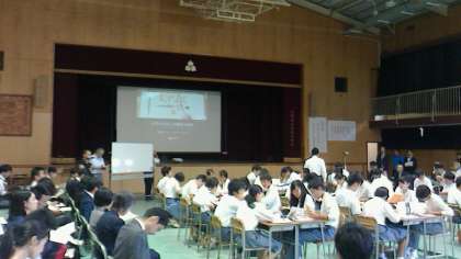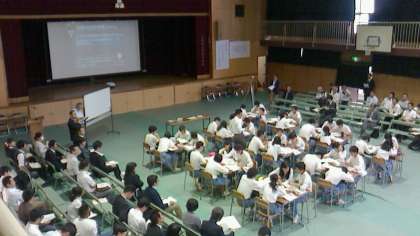 たくさんの教員に授業を見ていただくために、通常の教室ではなく、体育館での授業でした。
