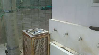 第2グランドにに設置してあるウオータークーラー水を、検査容器に取水し残留塩素・PH測定器を使っての検査でした。