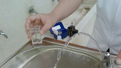 歌島中学校の学校薬剤師の宇高重人さんに、飲料水の水質検査をしていただきました。