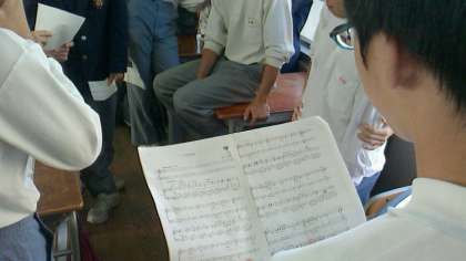 男性グループは、一度歌ってみて相談しているところでした。微調整をしながら楽譜を手に取り、担任の先生を交えて再度歌っていました。