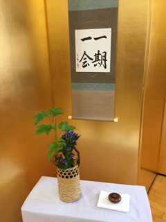 普段はバレーの練習で使われる部屋を茶室にして行いました。掛け軸に書かれた「一期一会」は一生に一度の出会いであるから、主人も客もお互いに誠意を尽くすという意味で、茶道に由来する四字熟語です。