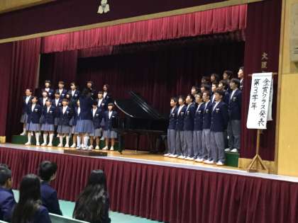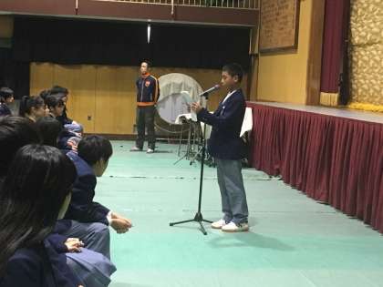開会宣言、副校長のあいさつ、昨日の3年合唱コンクールで金賞を受賞した3年7組の素晴らしい発表を鑑賞しました。