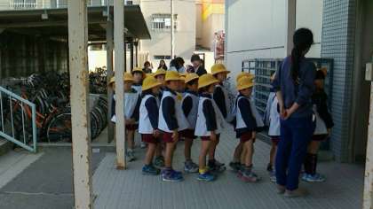 野里幼稚園からも園児が駆けつけました。(野里幼稚園の建物は2階建てのため、津波警報が発令され歌島中学校に避難に来ました。)