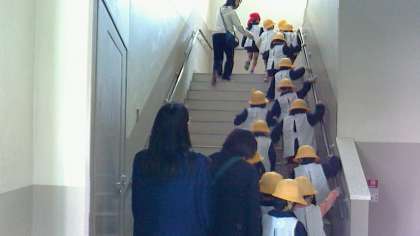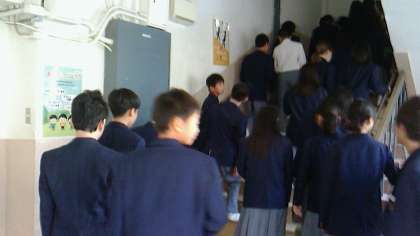 3年生は園児の後ろを上り3階・4階に避難しました。1年生は3階の講堂へ(下の写真です。)2年生は4・6号館の3階廊下へ避難しました。
