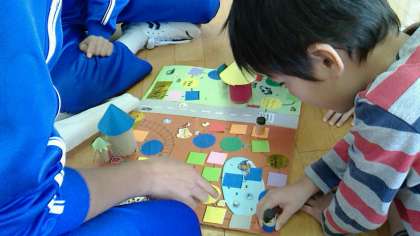 手製のすごろくゲームでは、色画用紙に配色を工夫したポイントを配して、立体的な建物まであり、まるで市販品のような楽しいものでした。子供たちが本当に楽しそうに遊んでいました。