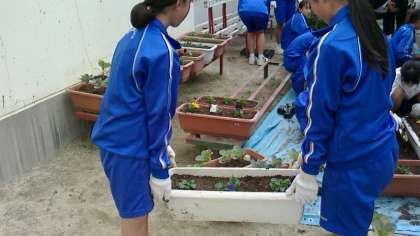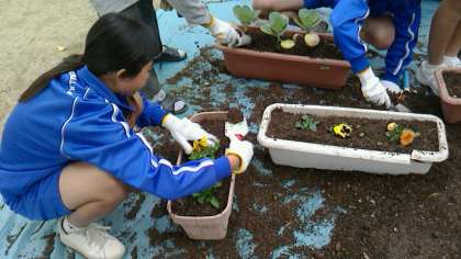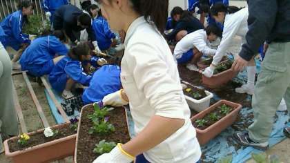 花苗植えにはたくさんの生徒が駆けつけてくれたおかげで、見る見るうちに完成していきました。完成したプランターはどんどん棚に運ばれていきます。