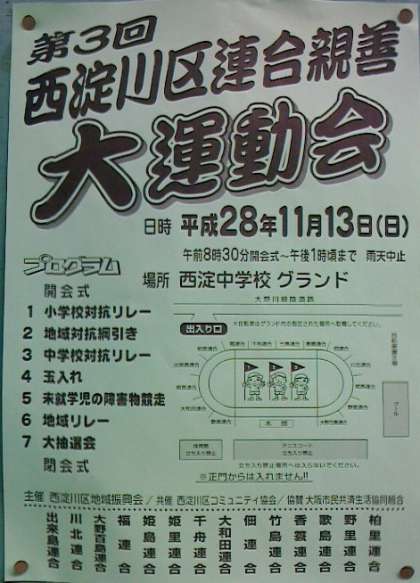 11月13日(日)西淀中学校にて、西淀川区地域振興会主催の、西淀川区連合親善大運動会が行われました。