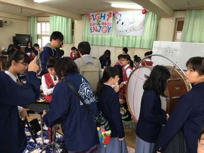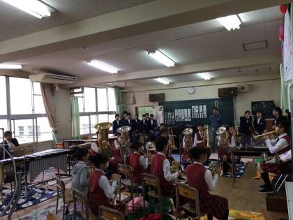 11月19日(土)、前日に引き続き、北海道の北見市立中央小学校ブラスバンド部の児童たちが、歌島中学校に練習にやってきました。