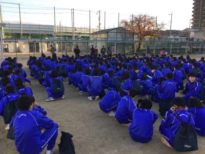生徒達は7時30分の集合時間に向けて、7時過ぎから登校してきて第1グランドに集まってきました。今朝も結構な冷え込みがあり、長袖体操服の中に半袖体操服・ハーフパンツを着用しての登校でした。