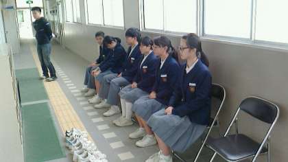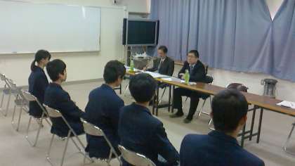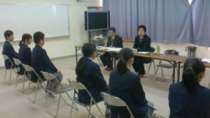 校長面接はミーティング室で行う集団面接です。面接官に好文学園高等学校から先生をお迎えしての面接です。好文学園高等学校の先生は、入学試験のときに実際の面接を担当される先生方です。歌島中学校の校長先生とともに面接をしていただきます。