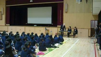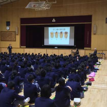 11月7日(水)6限目に、1年生徒を対象とした「歯と口の健康教室」を体育館にて行いました。歌島中学校の歯科校医さんと、新大阪歯科衛生士専門学校から2名の先生、合計3名の先生をお招きして行われました。