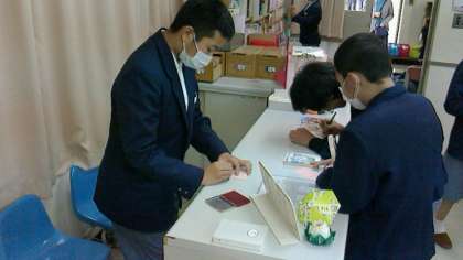 文化委員の生徒が貸出・返却手続きの担当者です。先生方に作業手順を教えていただき貸出・返却業務をしていました。