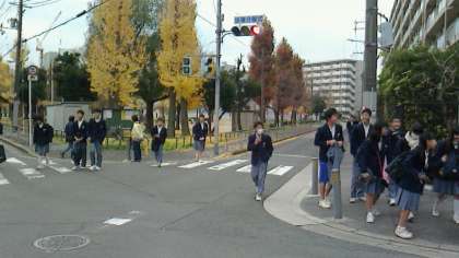 12月9日(金)の登校時の様子です。今朝も冷え込みがきつく、防寒具を身につけてきて信号待ちの間に取り外している生徒を多く見かけました。