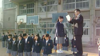 12月12日(月)、この冬一番の冷え込みで張りつめた空気のもと、全校集会がグラウンドでありました。