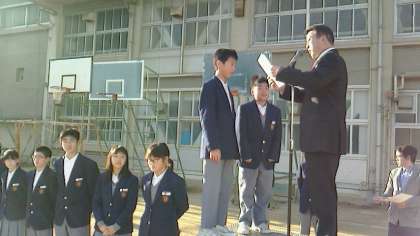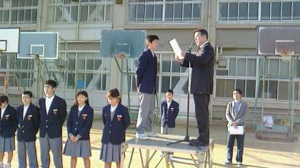 たくさんの表彰がありました。書道部、男子テニス部、野球部、そして男子バスケット部と各部での活躍が紹介されました。日頃の精進が評価された瞬間ですね。おめでとうございます!!
