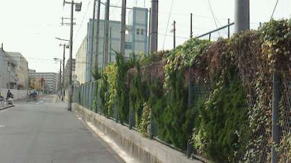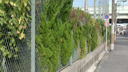 生垣のカイズカイブキの成長速度は早く、上だけでなく横にも枝を伸ばしていきます。枝はフェンスを巻き込んで、道路にも伸びてきていました。