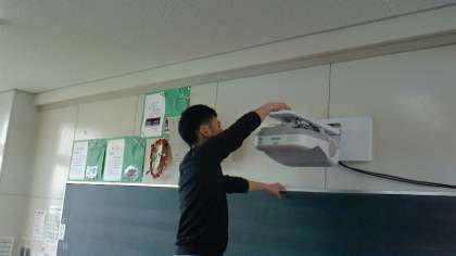 教室ではエアコンのフィルターを取り外して掃除する人。扇風機を抱きかかえるように拭き掃除する人。液晶プロジェクターの上面を手を伸ばして拭いている人。それぞれが自分で考えての高所での清掃活動でした。