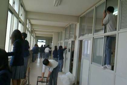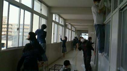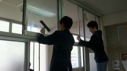 廊下の両側では、どのクラスも窓ガラスがきれいにふき取られています。洗剤とハンドワイパーで手際よく汚れを取る人生徒もいました。