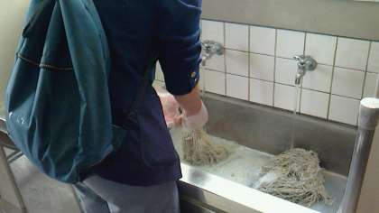 最後は使用した道具の洗浄と後片づけです。モップを一生懸命に洗ってくれている姿が印象的でした。