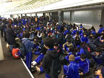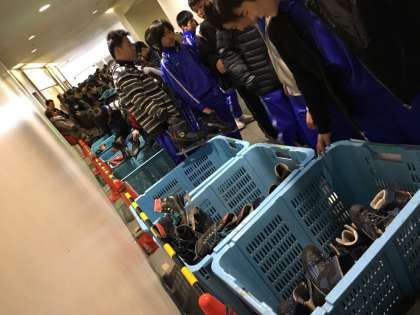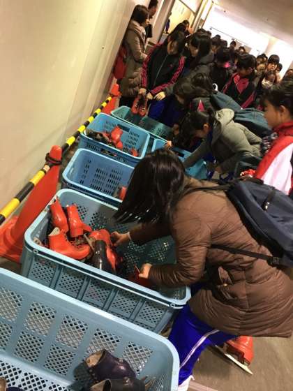 施設の方が、サイズ別に靴を出してくださっているのを、それぞれが受け取って、リンクサイドに集合しました。