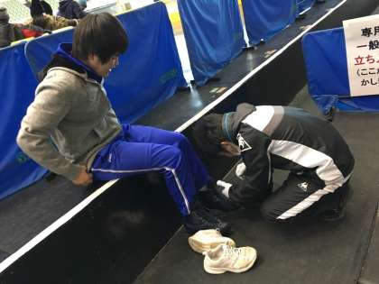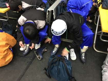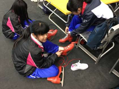 慣れない靴を履くのに四苦八苦。中には先生の力を借りる人も…。