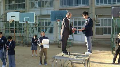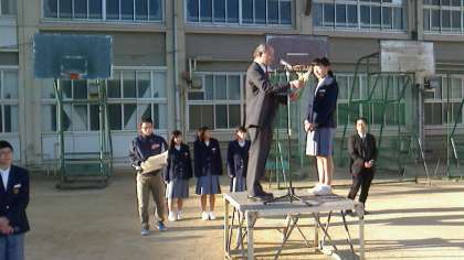 集会の始めに部活動等の表彰がありました。年末から年始にかけて生徒達の頑張りをたたえる表彰でした。