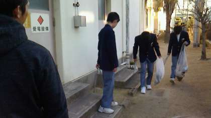 毎週月曜日に、1年生の委員長とボランティアの生徒が、早朝に登校して校舎周りの清掃活動を続けています。