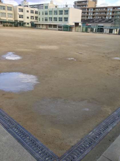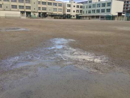 1月23日(月)は朝から気温が低く、生徒達の健康面から放送による全校集会を行いました。昨日の雨による水たまりは早朝からの冷気で、うっつすらと凍っていて、結晶が見られました。