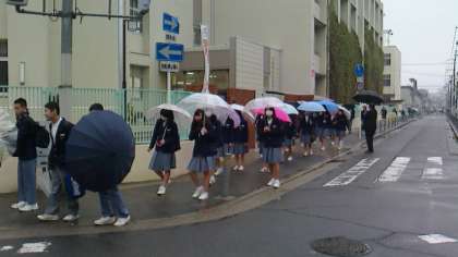 あいにくの雨空で生徒達は傘をさしての登校となりました。小降りな雨でしたので、傘なしの生徒もいました。正門に入る前に傘を閉じる生徒も多く見かけました