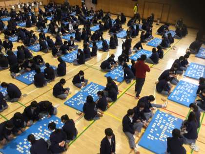 講堂から42枚の畳を運んできてきれいに並べられ、畳の両側に3〜4人が座ってのクラス対抗戦です。それぞれのチームが50枚の札を並べてスタンバイOKです。