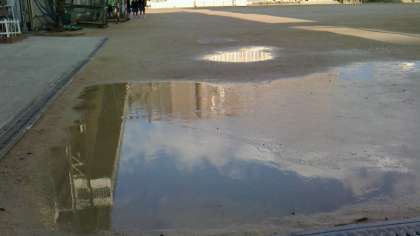 2月6日(月)は良く晴れていましたが、昨日の雨によるグラウンド不良のため、放送を利用しての全校集会となりました。いくぶん気温は暖かでしたが、風が強く水たまりにはさざ波のような風紋がでていました。