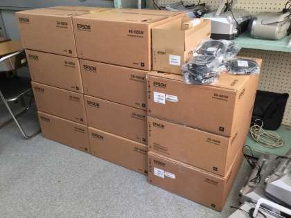本日大阪市教育委員会の予算で購入した、液晶プロジェクター(エプソンEB−685W)11台が追加納入されました。ちょうど1年前にも、大阪市教育委員会より、液晶プロジェクター12台が納入されており合計23台となり、1クラスあたり1台となりました。昨年納入された液晶プロジェクターは、3年生の教室の黒板の上の壁面に取付、多くの授業で使用されています。