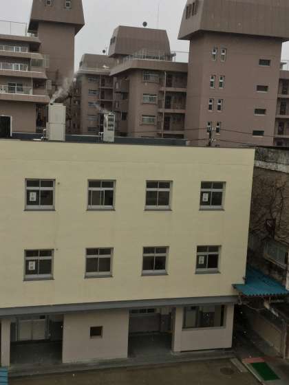 なかなか気温が上がらず、昼前にはみぞれ交じりの雨となってしまいました。屋上に設置してあるガスエアコンの室外機からの水蒸気は、真っ白になって立ち昇っています。