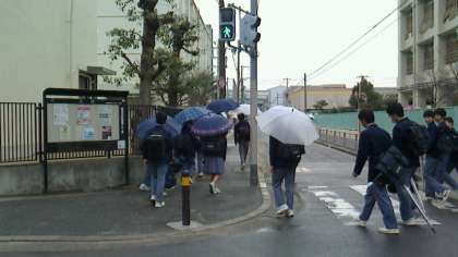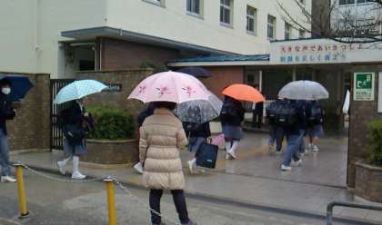 生徒の登校が始まってから雨となり、傘をさしての登校に変わり、カラフルな隊列となっていました。8時15分ごろには小止みとなり、傘を閉じての登校生徒も増えていました。