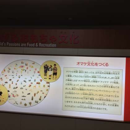 私にとってグリコといえば、「オマケ」のイメージがあり、いつの時代にも小さなおもちゃがついてた記憶があります。時代ごとの「オマケ」がたくさん展示されており、生徒達も熱心に見入っていました。