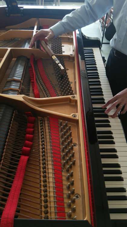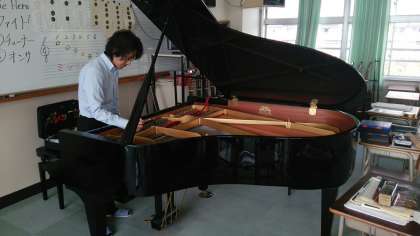 第1音楽室のピアノの調律では構造がよくわかりますね。調律師さんが何度も鍵盤をたたきながら、弦の張りを調節しながらチューニングハンマーでねじで締めておられました。