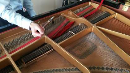 ピアノの調律は、道具を使用して弦の張りを調整します。体育館の舞台のそででは、照度が低く写真では調律の様子がよくわかりません。